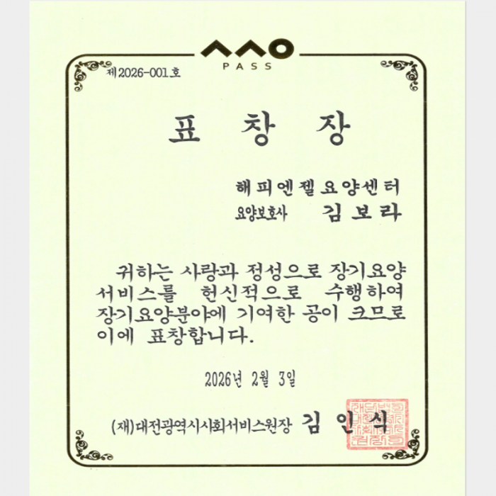 따뜻한 손길로 하루하루를 함께해 주신 시간이 이렇게 소중한 인정으로 이어진 것 같아